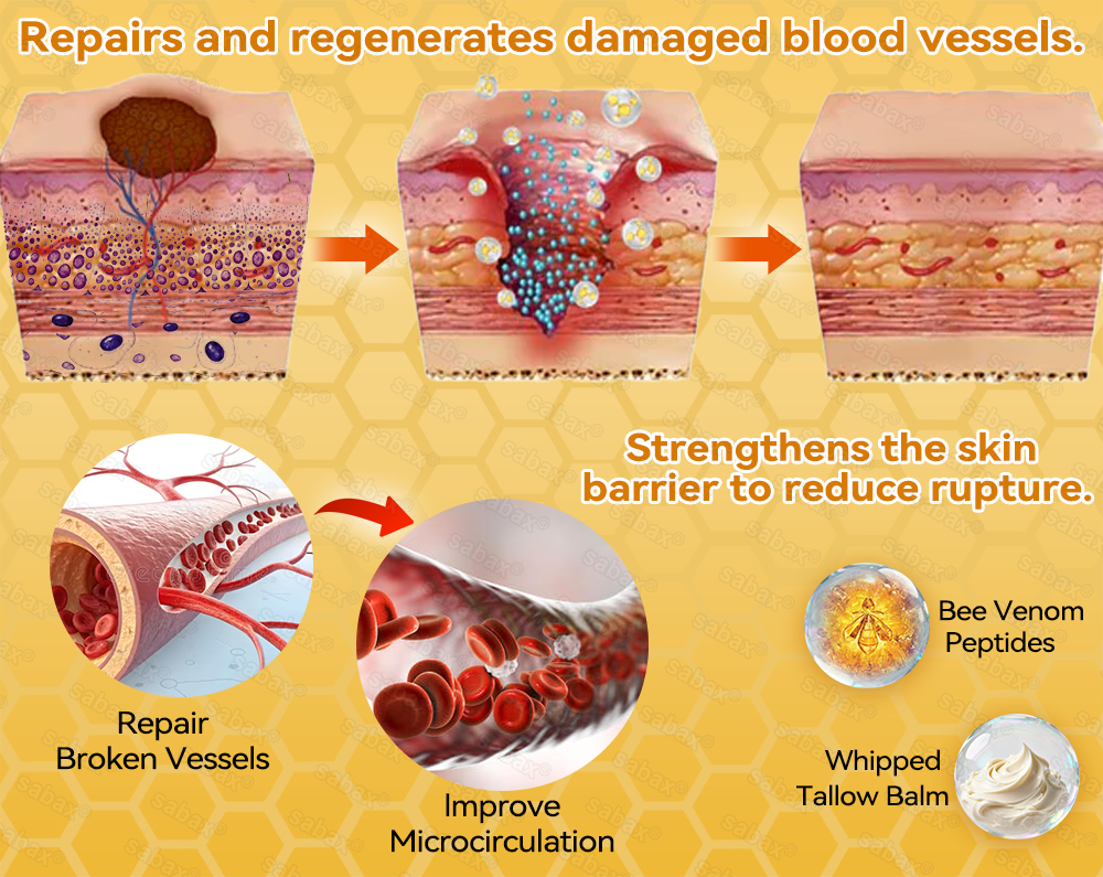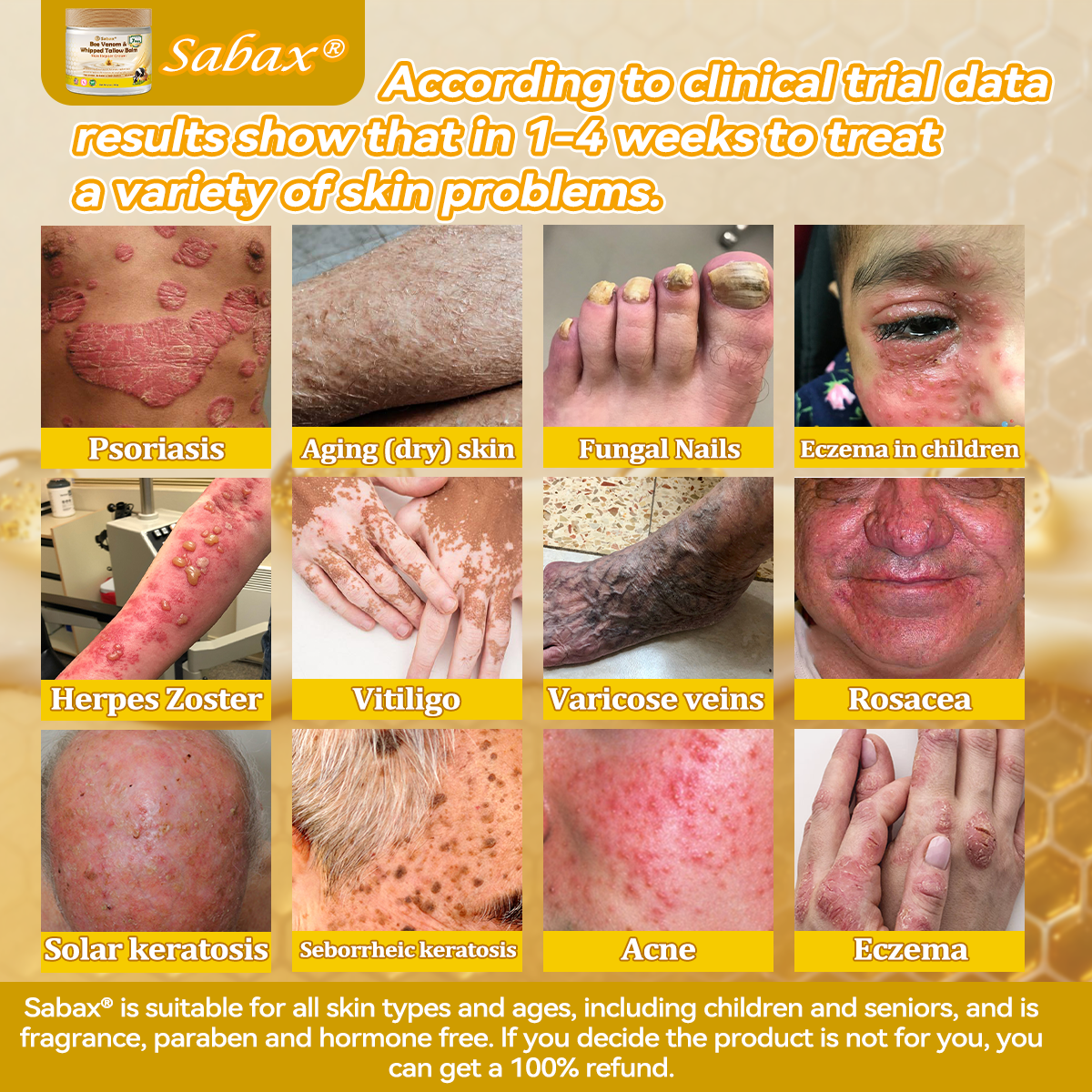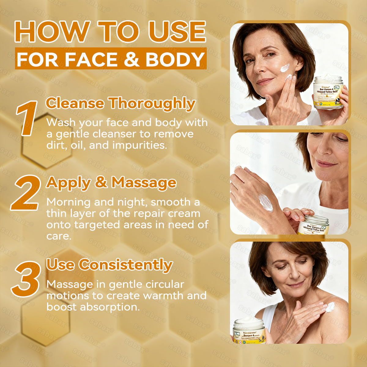 Sabax® Bee Venom & Whipped Tallow Skin Repair Cream was created by a team of 30+ dermatology and regenerative medicine experts after over three years of research and clinical validation. Powered by Bee Venom Peptides and nutrient-rich Whipped Tallow Balm, the formula is FDA-registered for safety and efficacy, and has been clinically tested by dermatologists worldwide—showing remarkable results in reducing wrinkles, age spots, purpura, eczema, acne, warts, scars, psoriasis, and skin tags.