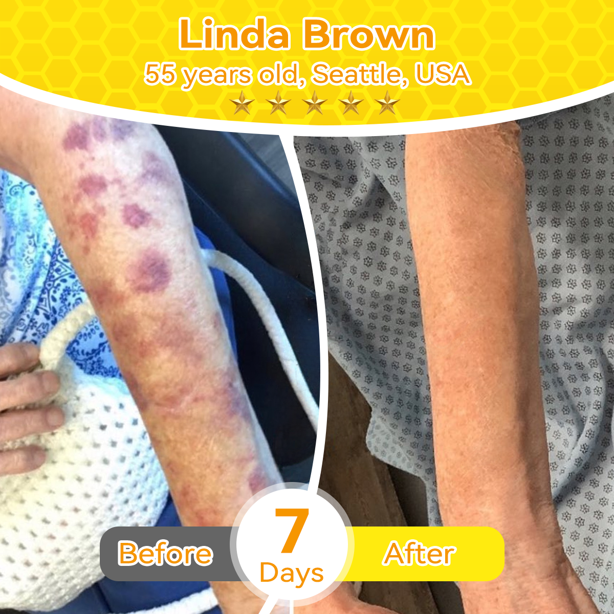 “I’m 55 years old and often get large purple spots on my arms—even without bumping into anything—and even a light touch can cause bleeding. My doctor says it’s senile purpura from aging skin and fragile blood vessels. I’d tried many creams before with little real help, so I didn’t expect much. But this repair cream with bee venom and beef tallow truly works: after just a few days, the bruising began to fade and I stopped getting new ones so often. It doesn’t sting or feel greasy, and my skin is now softer, smoother, and more hydrated—even the dry, wrinkled areas have improved. I’m so grateful I found this. No side effects, no flare-ups, and perfect for aging skin. If you or someone you love has a similar problem, I absolutely recommend giving it a try.” — Linda Brown, Seattle, USA