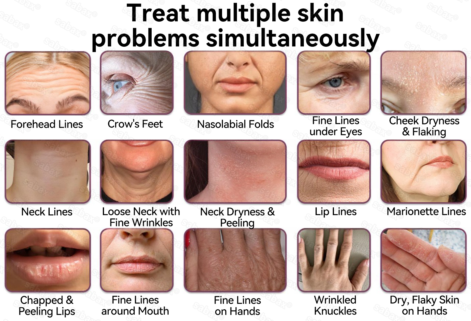 Wrinkles: Caused by the loss of collagen and elastin in the dermis, dehydration of the stratum corneum, UV aging, hormonal changes, and slowed metabolism. Sabax® Bee Venom & Whipped Tallow Balm Skin Repair Cream, enriched with Centella Asiatica, Acetyl Hexapeptide-8, and Whipped Tallow Balm, effectively reduces sunspots, wrinkles, and stretch marks. Safe for use on the face, arms, and even the delicate skin of new mothers’ stomachs.
