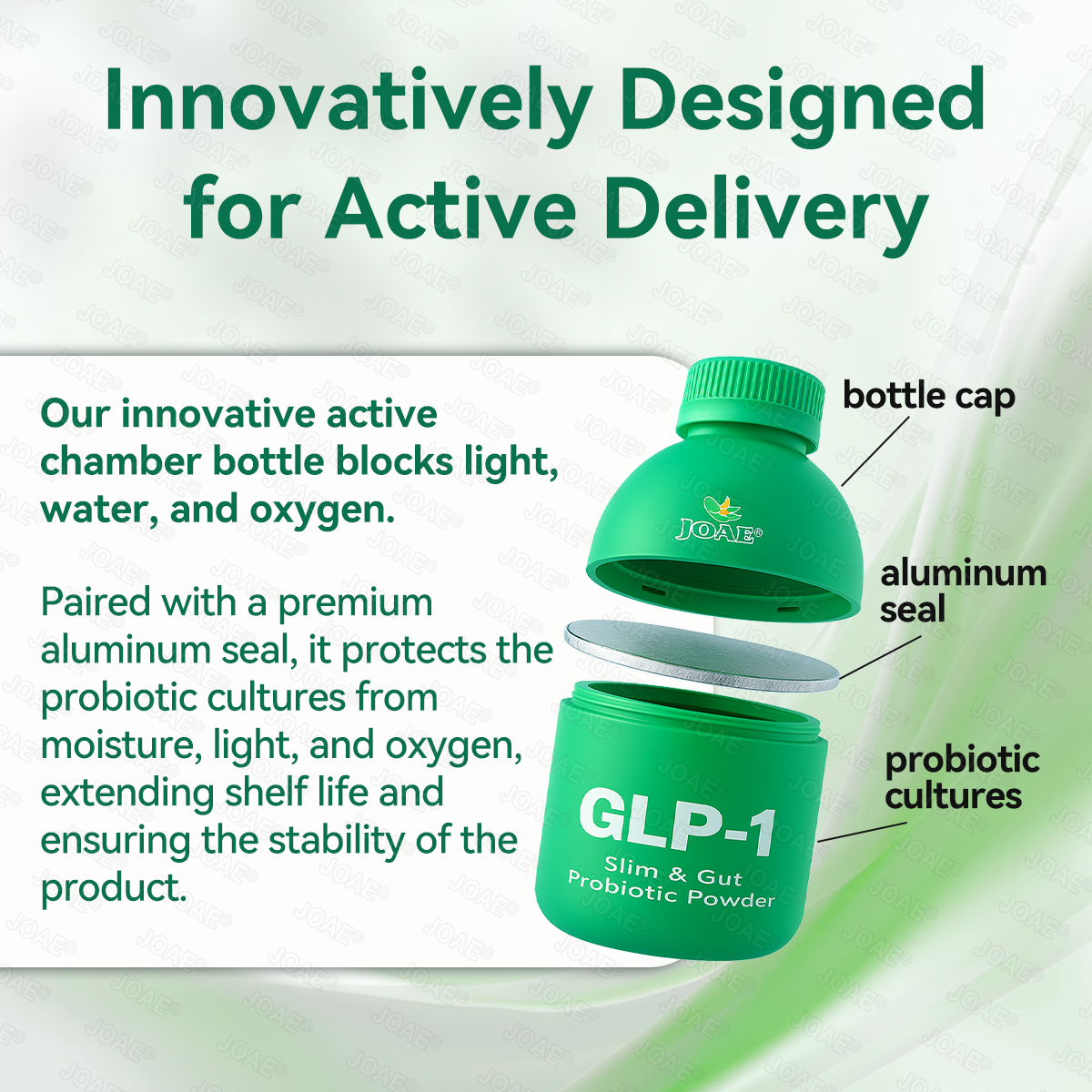 Featuring a patented âActive Chamberâ structure that provides comprehensive protection against light, water, and oxidation, effectively shielding active ingredients from external environmental influences. Paired with a premium aluminum foil seal design, it firmly locks in nutrient activity while preventing oxidation and loss. The integrated structure delivers long-lasting freshness retention and high-seal protection, ensuring active substances remain fresh, potent, and stable for extended periods.JOAEÂŽ is formulated with 300+ clinical study strains specifically designed for weight management and digestion, not commonly found in other probiotics or foods.