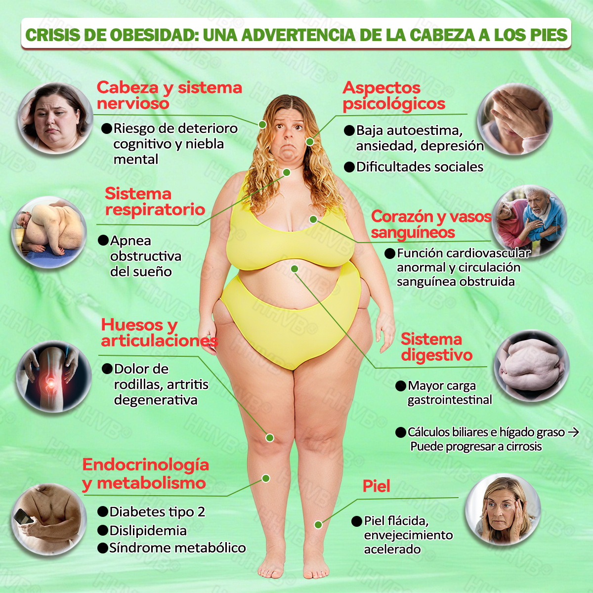 La causa raíz de la obesidad se encuentra en los desequilibrios hormonales y la disfunción metabólica. Una tiroides lenta reduce la eficiencia en la quema de grasa, mientras que el estrés crónico eleva los niveles de cortisol, lo que provoca exceso de grasa abdominal. La resistencia a la insulina hace que el exceso de azúcar se almacene como grasa, y una mala circulación linfática genera retención de toxinas y líquidos, agravando la hinchazón y la acumulación de grasa. Además, una regulación deficiente de la leptina en el hígado altera las señales de saciedad, impulsando el exceso de comida y creando un círculo vicioso. Los factores del estilo de vida moderno —dietas altas en azúcar y grasa, falta de sueño y escasa actividad física— ralentizan aún más el metabolismo, haciendo que la grasa sea aún más difícil de eliminar. Con el tiempo, la obesidad no solo afecta la apariencia, sino que también aumenta el riesgo de problemas de salud graves, por lo que la intervención temprana es fundamental.